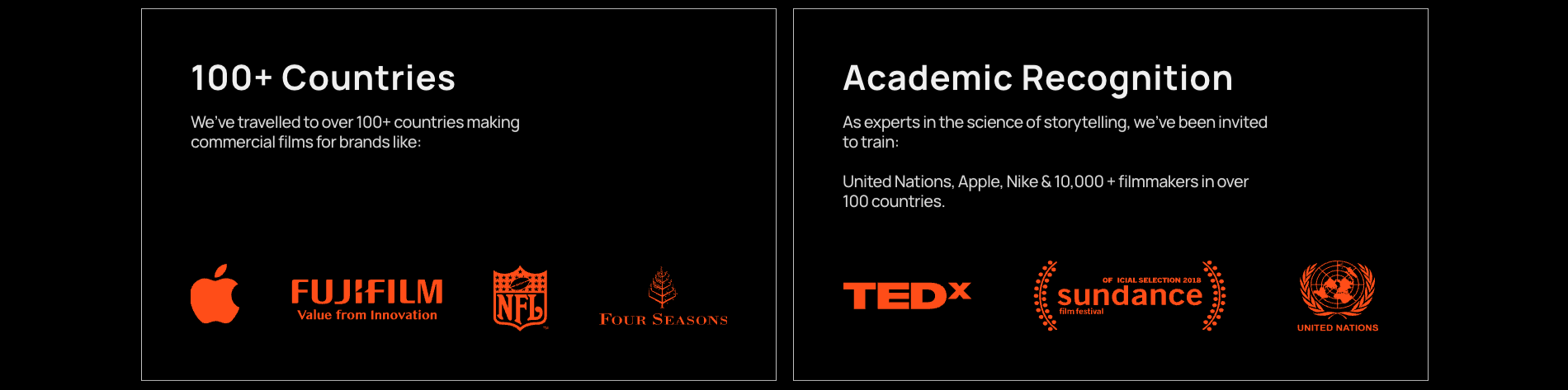 As experts in the science of storytelling, we’ve been invited to train: United Nations, Apple, Nike & 10,000+ filmmakers in over 100 countries.